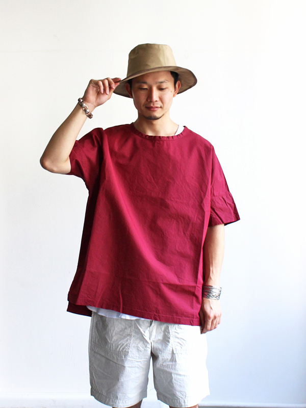 シャリ感のある洗いのかかった生地が特徴的なスモックシャツです。 コットンシルクの生地を使用し、リラックスした着用感でありながら上品な雰囲気も感じられます。 ゆったりざっくりとしたサイズ感、シームレスの肩が緩い落ち感のある力の抜けたシルエットが特徴の一枚。 アームホールも広め、前後で丈の違う着丈で、レイヤードスタイルにも便利。 全体的にややゆとりを持たせたリラックス感漂うシルエットに仕上げています。
