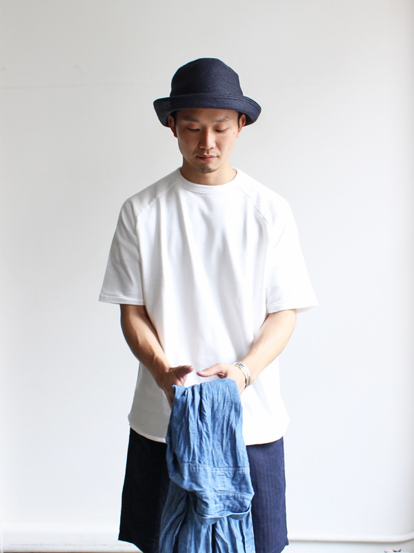 薄めの柔らかい素材感のコットンを使用、ネックまわり袖口はフライスでトリミングしてあります。