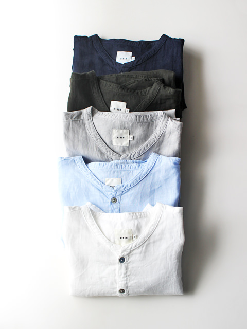 RINENより、80/1リネンローンのヘンリーネック半袖シャツです。80番単糸の細番手のリネン麻を平織りに柔らかく織っています。薄手の素材でこれからの季節さらっと着れるアイテムです。
