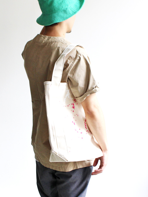 旅行用のトートバッグ。こちらはペンキ柄です。サイドの持ち手は荷物が重い時の補助的な役割や、荷台などからバッグを降ろす時に引っ張り出しやすいように取り付けられています。普遍的なデザインなので、ユニセックスで使っていただけます。