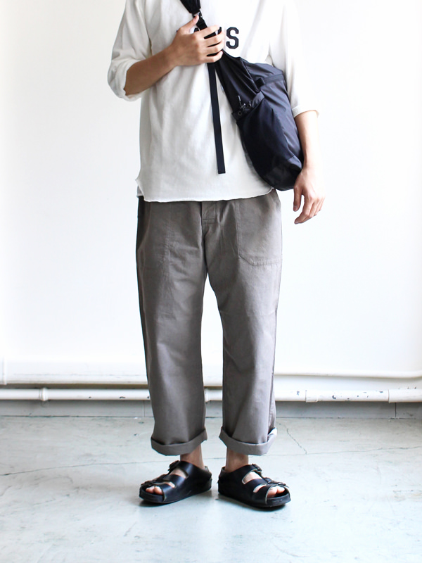 こちらはシルエットが変わり、ゆったりとしたルーズな雰囲気に仕上がりました。フロントはスナップボタンにボタンフライ、サイドに入ったゴムのウエストの仕様が特徴的。またウエストの内側には紐も通っていて、とても楽な穿き心地且つ抜群のフィット感。ロールアップすれば内側のホワイトの綾テープがアクセントになります。