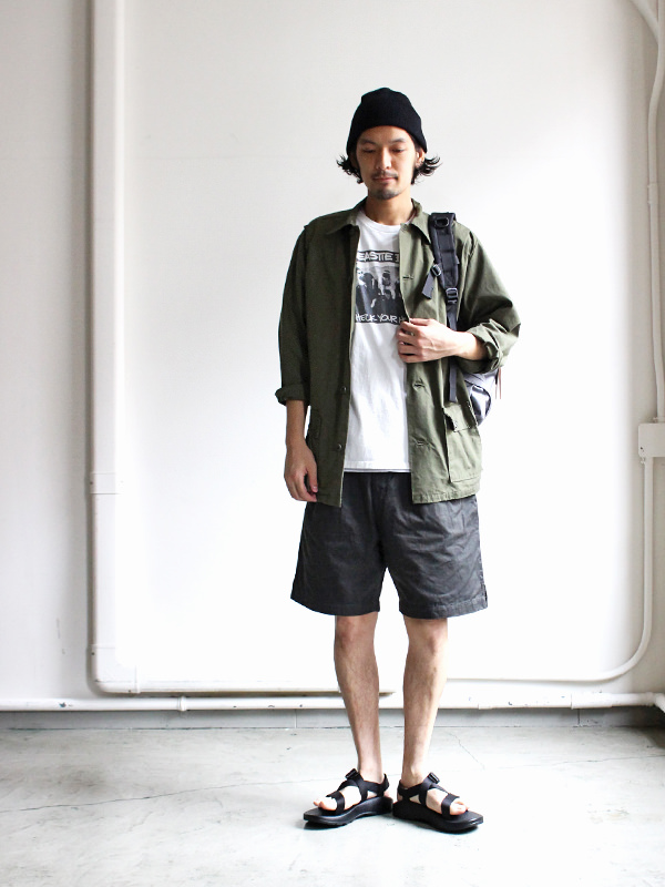 しっかりとした生地感のツイル素材になります。洗いのかかった生地感なので、これからの季節にオススメです。ウエストはゴムと紐で調整いただけ、ヒップ周りもゆったりとしているのでリラックスして着用頂けます。