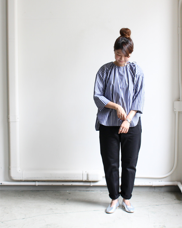 シルエットは股上を深めの設定にし、わたりはゆったりと余裕をもたせながら